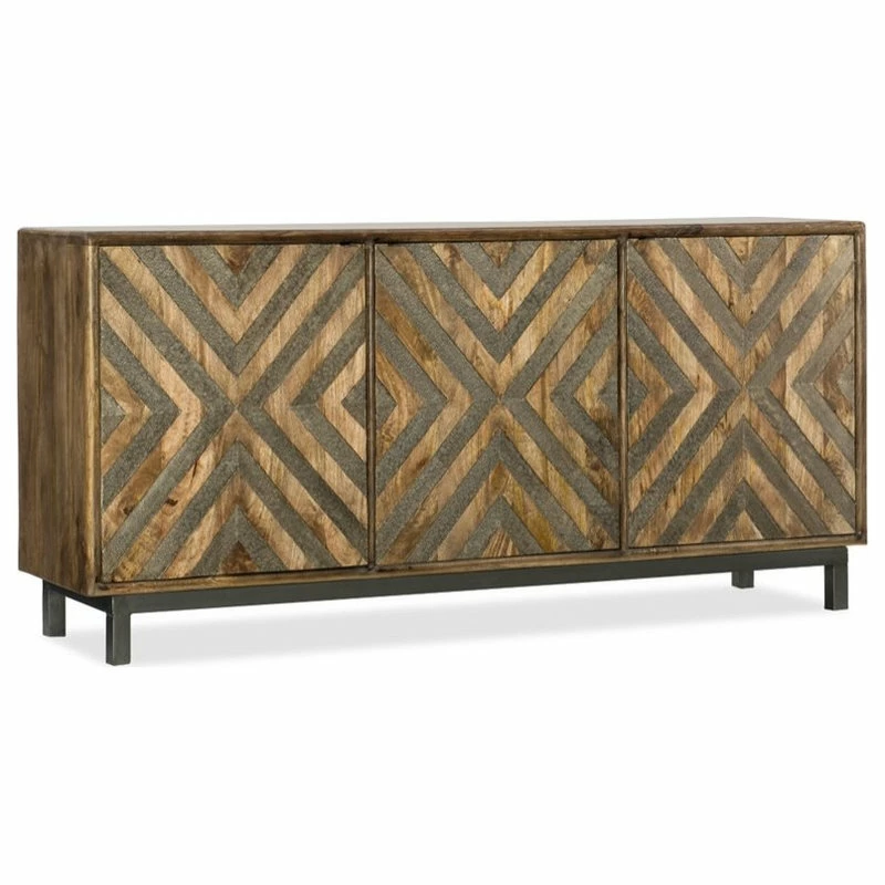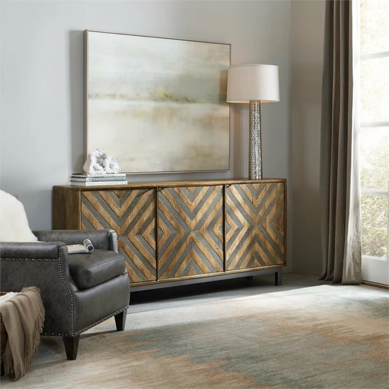 With a chic designer look for sophisticated casual appeal, the Beaumont Lane Console is crafted of Mango Wood and features a German silver metal chevron-patterned inlay on the front with dark pewter-colored European pulls. Accommodating up to a 70-inch TV, the console has 3 doors and 3 removable shelves with a ventilated back panel.