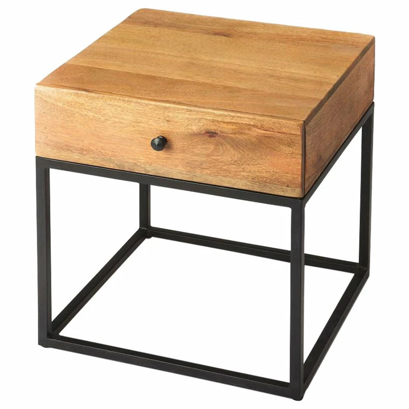 The minimalistic industrial styling of this square end table is an ideal addition in any modern space. Supported by a black finished iron base, its drawer box is constructed from mango wood solids and wood products in a natural finish. With clean lines and convenient drawer, the table also makes a great nightstand.