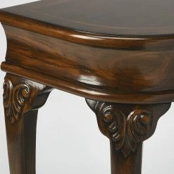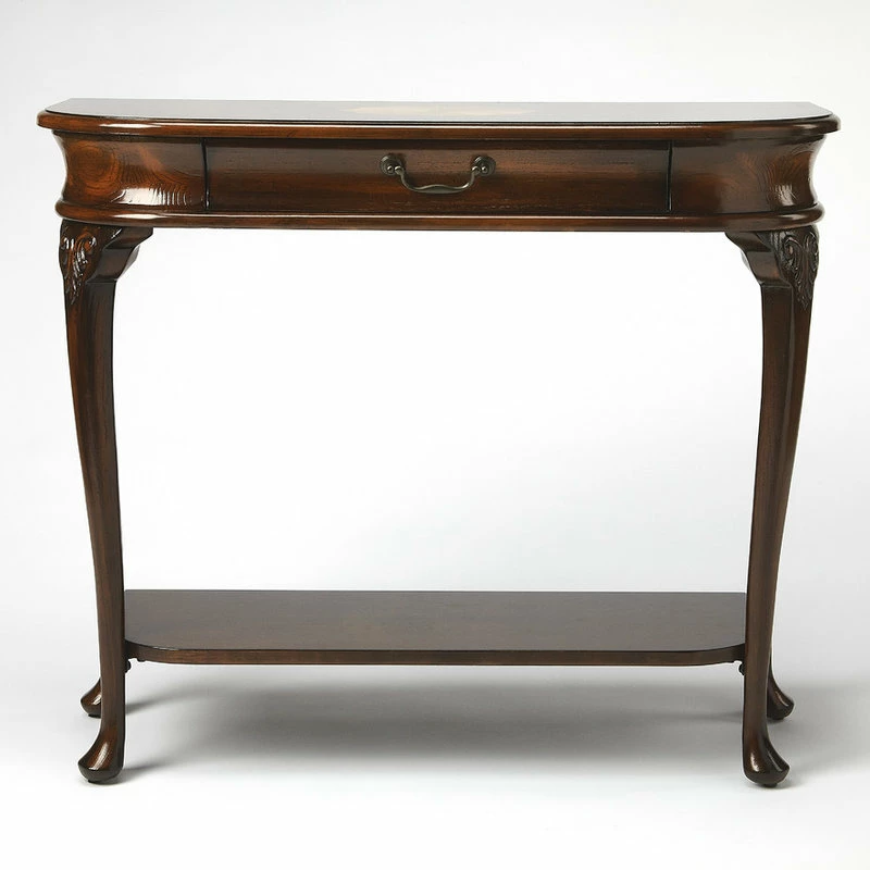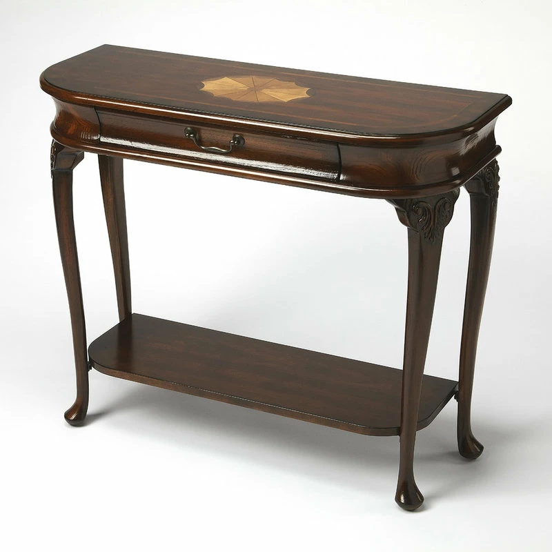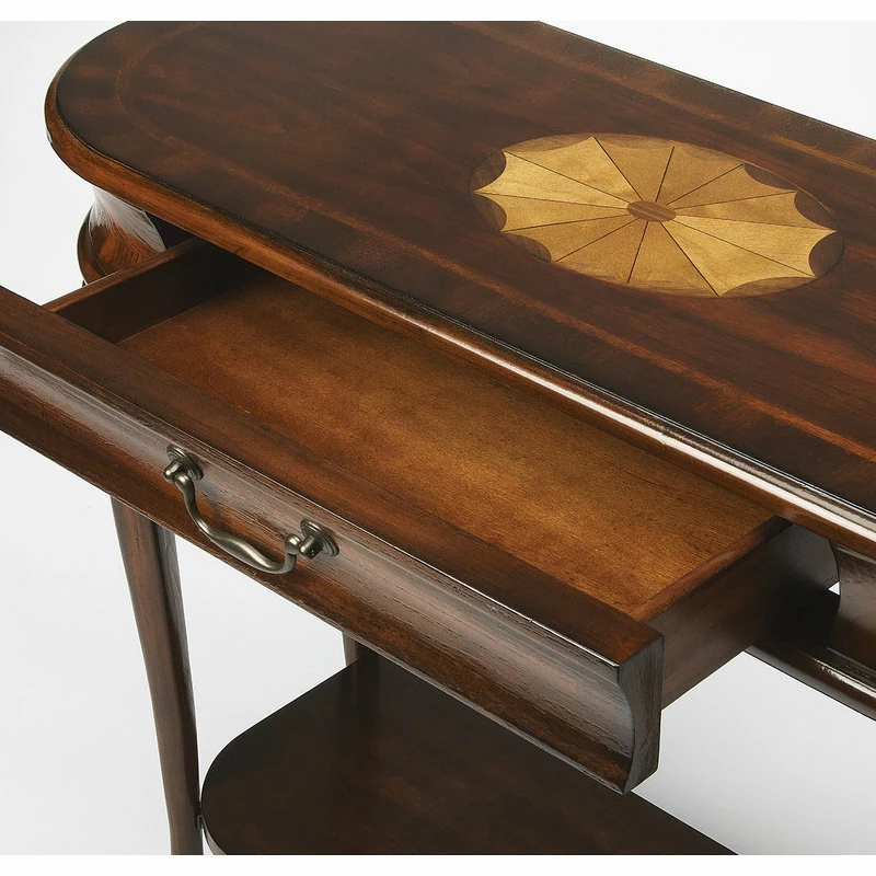 Selected solid woods, wood products and choice veneers. Features a cherry veneer top with a linen-fold inlay design of maple, walnut and cherry veneers. The top border is a cross grain cherry veneer with an inset inlay of maple veneer. Cherry veneer sides, drawer front and lower shelf. Drawer has antique brass finished hardware.