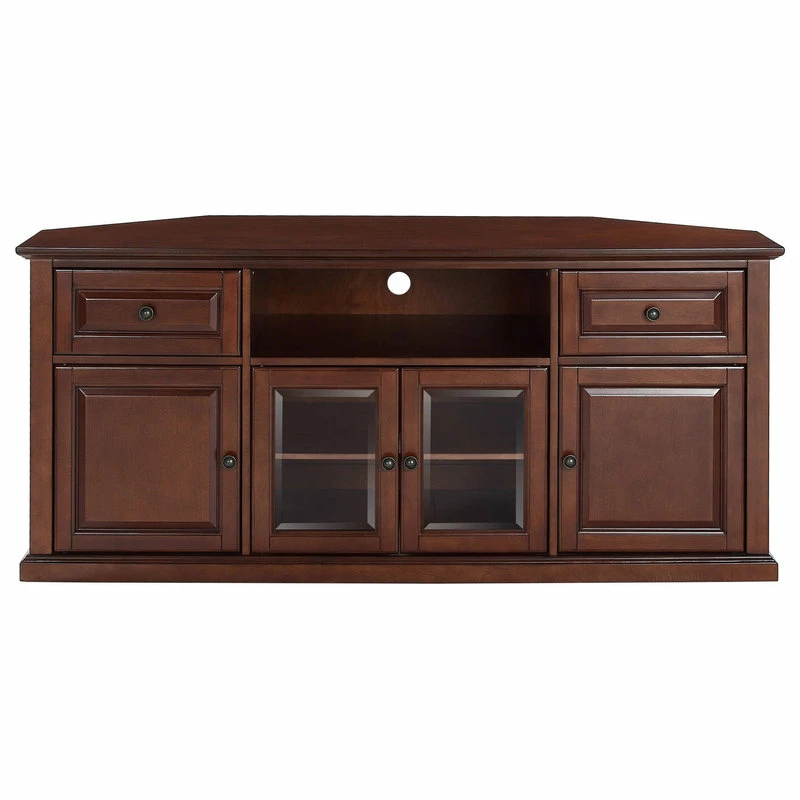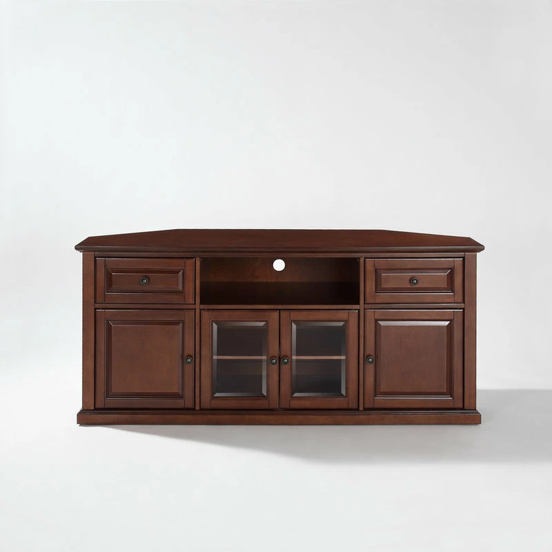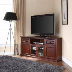This signature corner TV cabinet accommodates most 60″ flat panel TVs, and is handsomely proportioned featuring character-rich details sure to impress. The hand rubbed, multi-step finish is perfect for blending with the family of furniture that is already part of your home. Features raised panel doors for concealed storage and also tempered beveled glass doors not only add a touch of class; they protect those valued electronic components, while allowing for complete use of remote controls. The open storage area generously houses media players and the like. Adjustable shelving offers an abundance of versatility to effortlessly organize by design, while cord management tames the unsightly mess of tangled wires.
