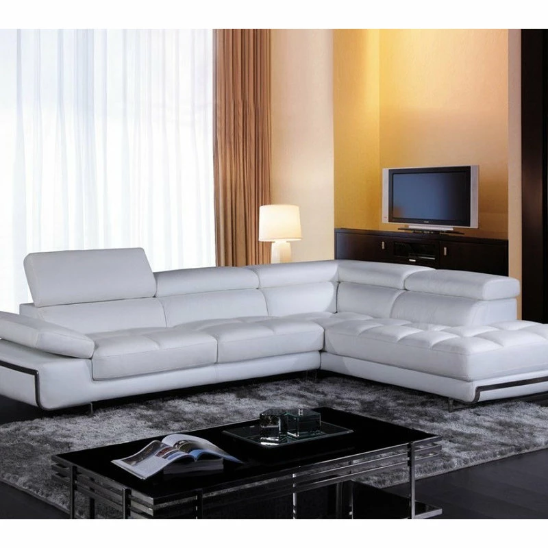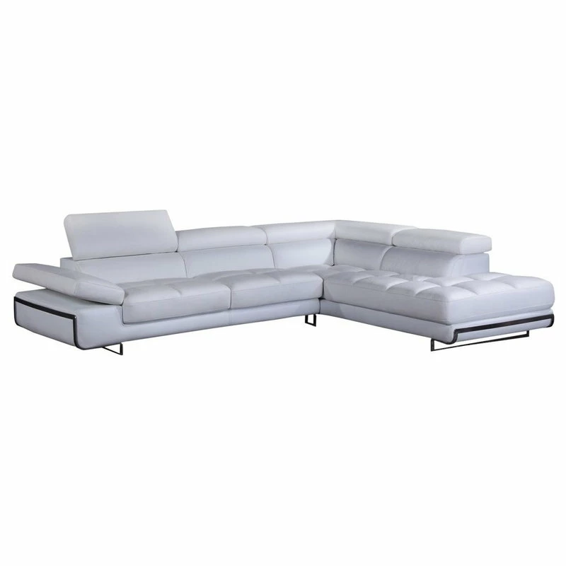 Exquisitely designed to provide lavish comfort is the Divani Casa Myst Mini Modern White Eco-Leather Sectional Sofa. Upholstered in dainty white eco-leather, it includes a right facing chaise, making you comfortable in your preferred position either sitting, lying down, or just in a reclined pose. Providing ergonomics and enhanced comfort are the rectangular adjustable headrests. Fitted with a cushioned back and a wide slightly slanted flared arm, it comes with high quality cushioned seats with tufts. The space between the flared arm and elevated left facing base offers space for magazines. Exquisite sturdy metal legs that seem to “cup” the outer side of the arms offers a stunning accent to the white upholstery. This modern eco-leather sectional is definitely a fashionista out to turn your living room into a huge posh stage.