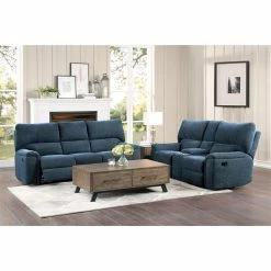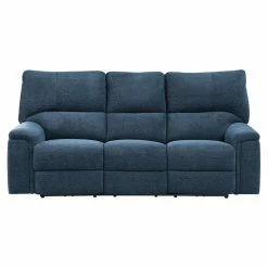 The unfettered design of the Dickinson Collection allows for perfect placement in homes with decorative themes that range from modern to transitional. Offered in indigo chenille, the sofa features dual end manual motion reclining mechanisms. The manual motion mechanism is engaged with a pull of the side mounted tab, taking you from seated to reclined in an easy motion. The expanse of the streamlined pillow-top arms furthers the comfort level of your downtime.