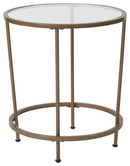 Lend your home or office sitting area a sophisticated, polished look with this round clear glass end table with matte gold metal legs.. This table combines a clear glass top with straight legs to provide a contemporary look that’s sure to tie any trendy room’s presentation together. The surface area serves as a convenient space for holding belongings or displaying magazines, newspapers, and brochures. Meanwhile, its compact construction allows it to fit perfectly between sofas and loveseats, or in corners of rooms. Plus, the glass offers a distinct, upscale look, and is tempered for superior strength to ensure it won’t break even after heavy use.
