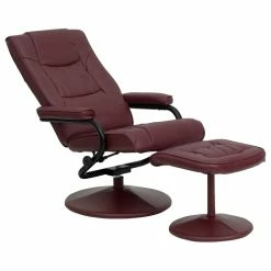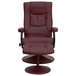 Contemporary Multi-Position Recliner And Ottoman With Wrapped Base In Burgundy Leather Soft If you need a great excuse to kick back and relax this burgundy recliner and ottoman set with soft and durable LeatherSoft upholstery is just the ticket. Ease into this luxurious chair with its padded seat and back, integrated headrest and plush upholstered arms. A knob, conveniently located under the right arm, brings the chair to a full reclining position. Easily clean spills with a water-based cleaner. This contemporary recliner with matching ottoman is a comfortable place to spend a little quality time. Product Dimension: 27.25″W x 29″ – 39″D x 37.5″H