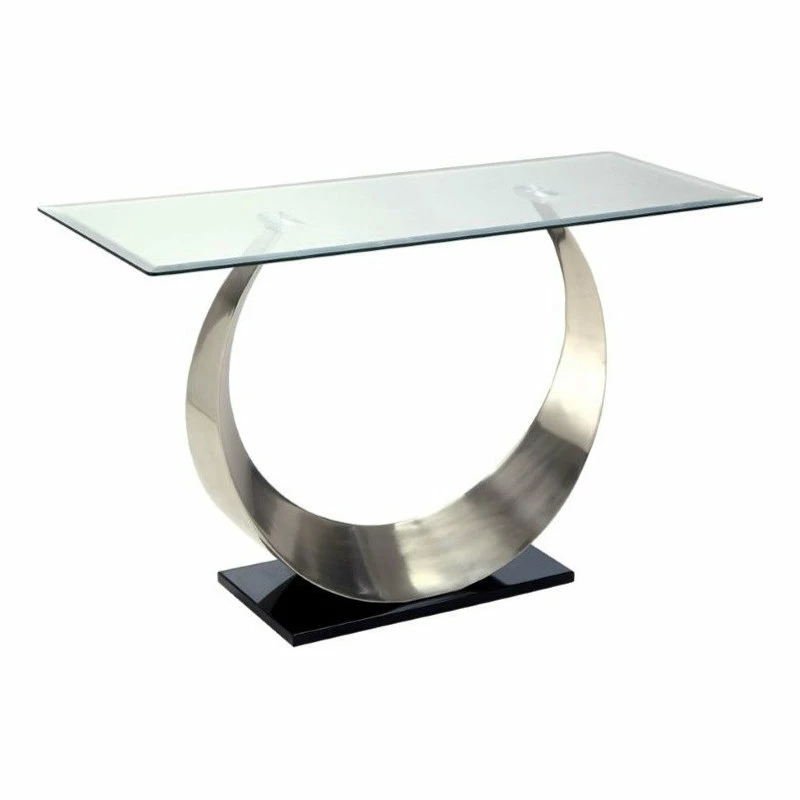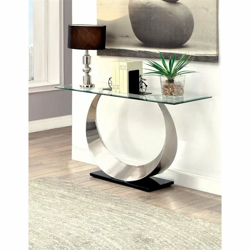 Mesmerize your guests with the chic Suse Stainless Steel Console Table in silver tone. Featuring a sleek tapered glass top that rests steadily on a luxurious satin plated steel, it redefines sophistication. The glossy black base accentuates the simplistic style and reinforces the frame to ensure decor, framed pictures and other items rest securely on top. Place the Suse Console Table in your entryway for a natural focal point that shines every time you step in the room.