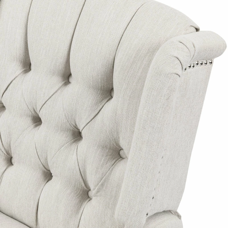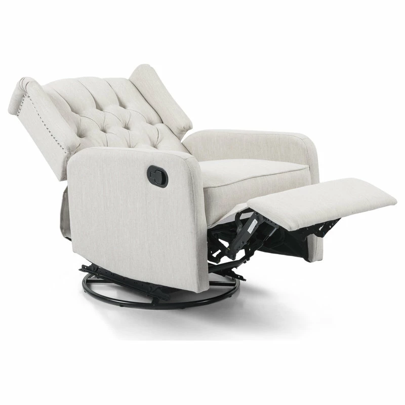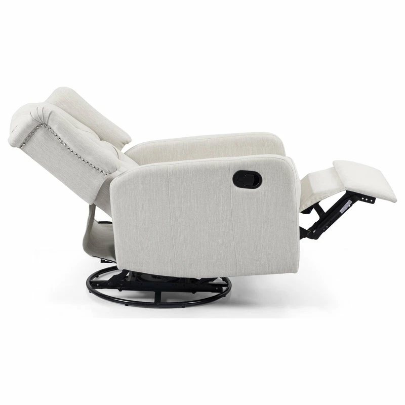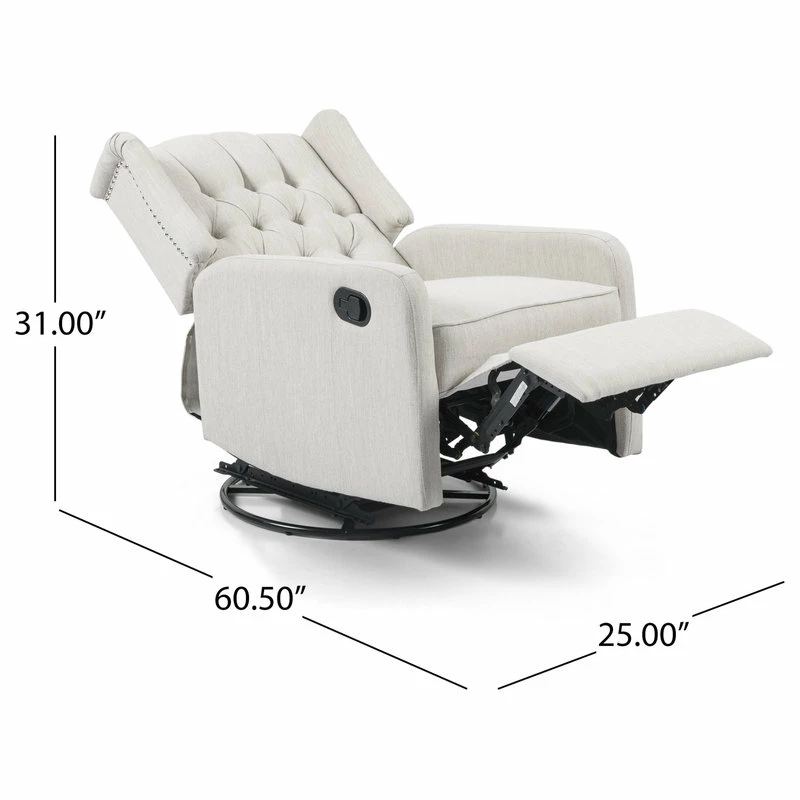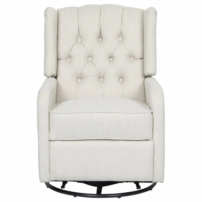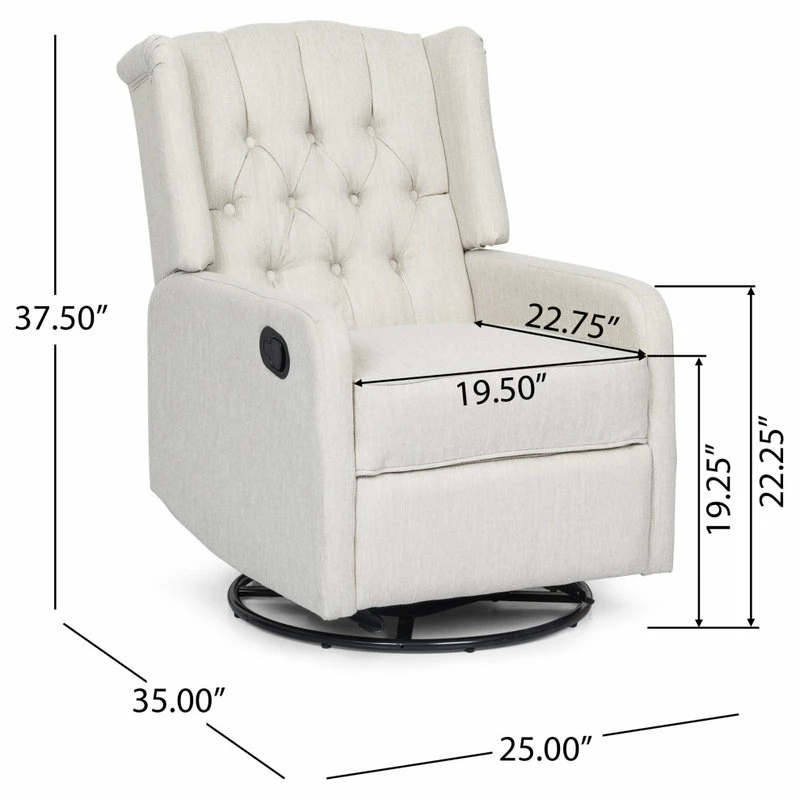 Whether you are settling back in your living room or are in need of stylish nursery seating, this recliner is sure to become your new favorite spot of leisure. Our charming recliner chair provides an incredibly high degree of coziness in an attractive package with its smooth upholstery and contemporary atmosphere. Featuring a graceful wingback design, button tufted diamond stitching, and a stunning nailhead trim, this exquisite recliner is perfectly complemented by its swivel function, allowing you to enjoy ultimate relaxation with little effort.