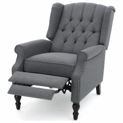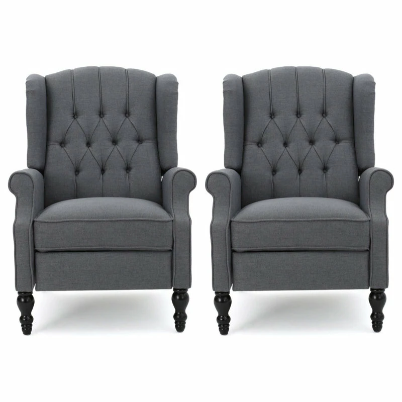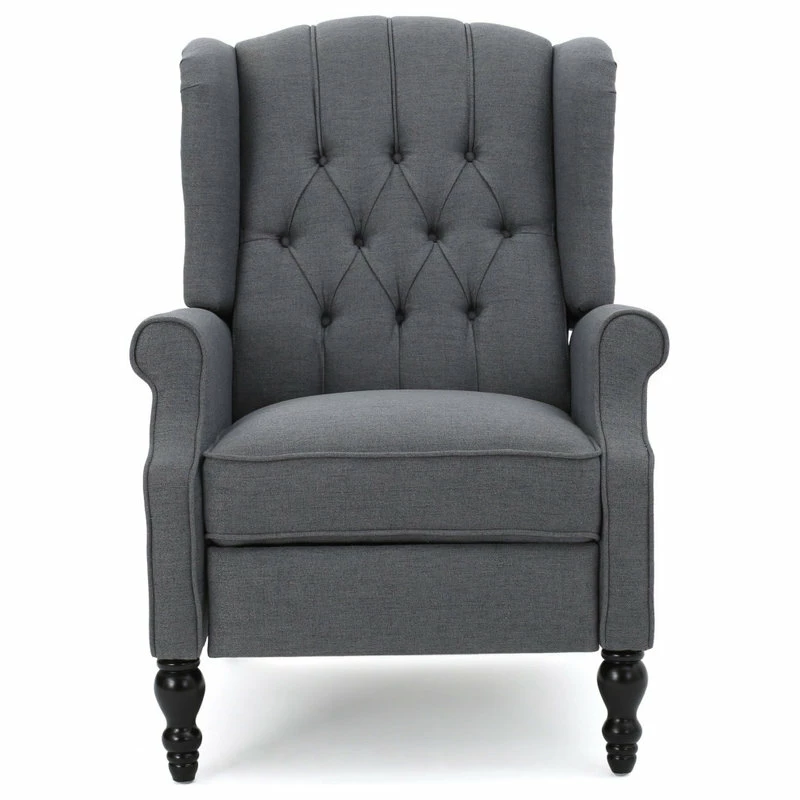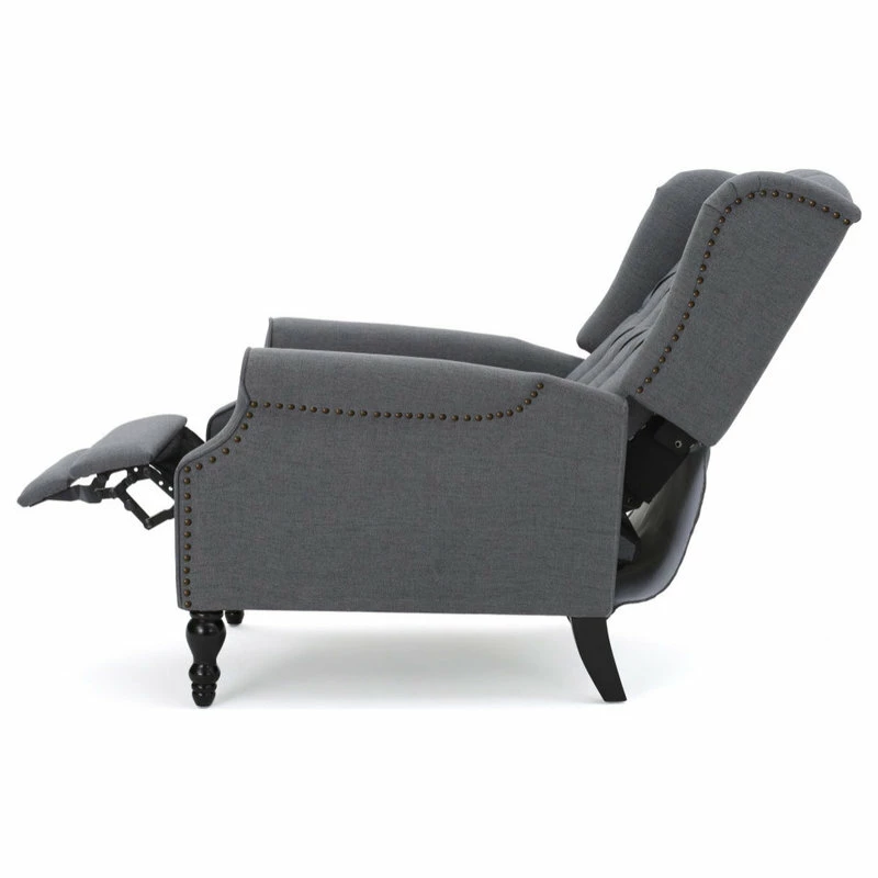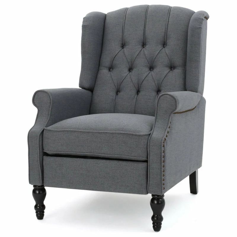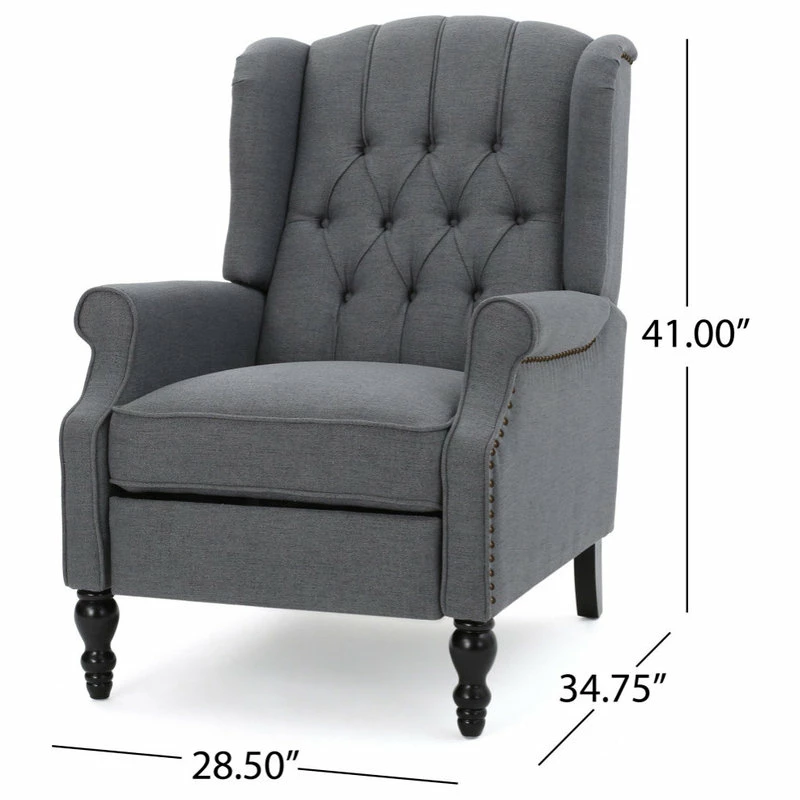 Luxurious comfort and refined style are at your fingertips with our timeless recliner. Sure to bring your interior space a stunning upgrade, our armchair uses a smooth pushback reclining mechanism and carefully crafted accents to tie your home together with absolute sophistication. This pushback recliner features gorgeous details such as button tufting, diamond stitching, tonal piping, and an outstanding studded trim to bring your decor to the next level. Finished with a lovely wingback design and rolled recessed arms, our recliner is as stylish as it is functional.