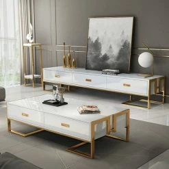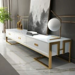 Featuring the sleek lines and glistening gold stainless steel base, the Jocise Collection brings a modern, stylish touch to any space. Thanks to its elegant and timeless profile, this TV stand will bring a pleasing style to the forefront of your space. With a spacious top, it can flawlessly hold your television and media games, as well as an array of art pieces. Boasting three roomy drawers, it is great for storing DVDs, remote control units, books, and other odds and end. Premium tempered glass surface stays lustrous and beautiful and is easy to clean as well, while the stainless steel base ensures a steady support. Give your home a modern charm with this chic tv stand!
