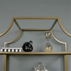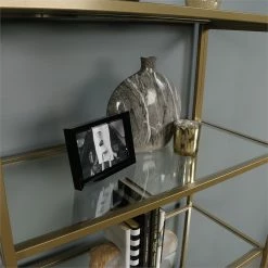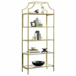 - 5 Shelf Bookcase in Satin GoldGive your space a sophisticated update with this bookcase from the International Lux collection. It features open shelving with safety-tempered glass so you can store and display books, plants, decor and more. Constructed from metal and finished in Satin Gold, this elegant bookcase will have any room in your home feeling luxurious and chic.