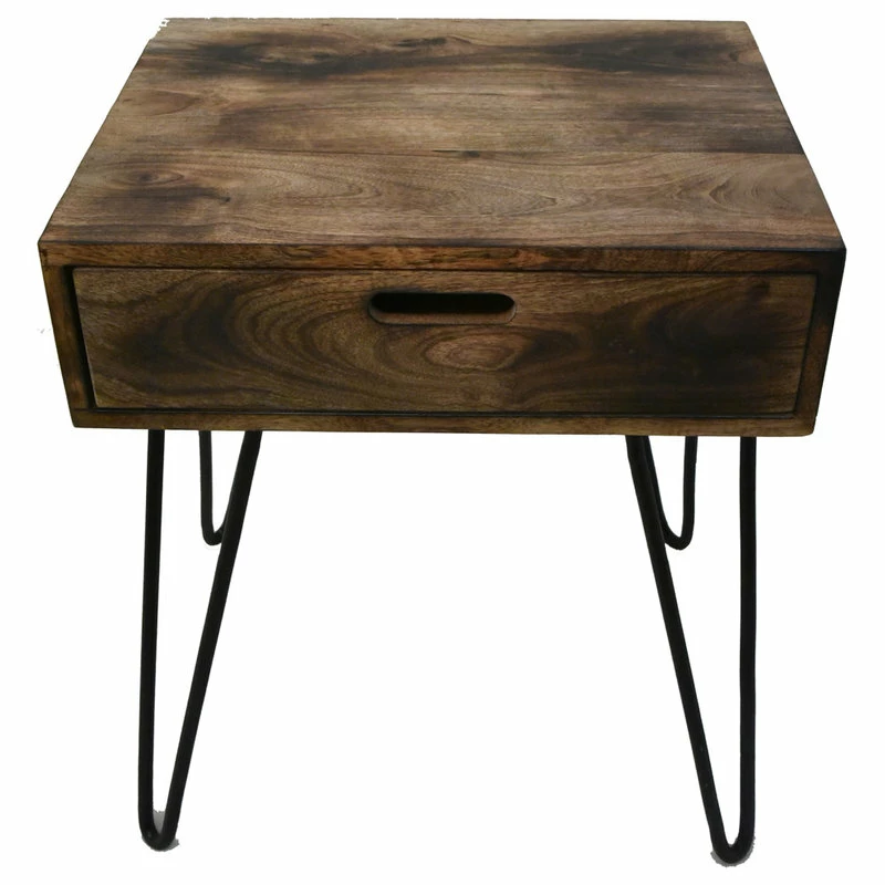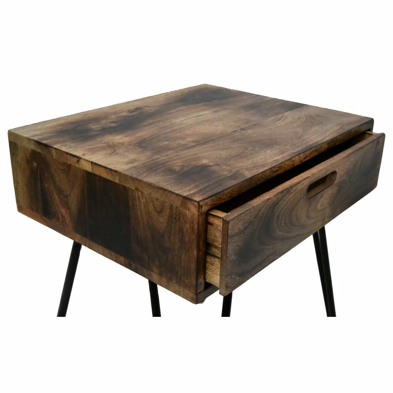 Accent tables are styled to accentuate their surroundings, but this one of a kind table attracts attention all on its own. Breaking conventional molds by seamlessly blending rustic charm and modern solidity all into one visually stunning piece, this table incorporates a rich mango wood with a functional drawer on wooden glides. Flawlessly constructed, it is further adorned with cast iron hairpin legs outfitted in a beautiful rustic black. The stark contrast of both metal and natural wooden elements lend spectacularly to creating visual interest in any room of the home, while the one of a kind natural burnt finish created by hand-scorched detailing ensures that each table has its own unique artistry that will set it a notch above the rest.
