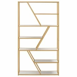 Showcase your most treasured trinkets with some glitz and glam with the Geometric Gold Finish Powder Coat Metal Bookcase. Clean-cut lines decorate this bookcase to lend a geometric appearance, guaranteed to be a showstopper in any space. Six airy shelves provide ample space to display your belongings and alternate in length to accommodate objects short and tall. There is more than enough space to decorate with collections of books, vases, potted plants, framed photos, and other pieces of home decor. A sleek and sturdy metal frame provides support and stability and the shelves feature a white finish that beautifully complements the shimmering gold metal.