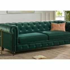 Stylishly impeccable, the Winston Chesterfield Sofa Collection by Jennifer Taylor Home provides the finest luxury seating for your home. Richly upholstered in vegan leather, this lush sofa evokes the classic Chesterfield design with hand-applied button tufting, smooth curled arms, spacious seating for 3, dark espresso legs, and studded antique brass nail heads. The Winston possesses a sophisticated vintage chic that never goes out of style, and with its faux leather fabric treated to resist cracking and peeling, this sofa is sure to remain a centerpiece in your living room, guestroom, or parlor for years to come. Two convenient casters are included on the front legs for ease of relocation. Cushioning includes a foam-down blend. To bring the whole room together, the Winston is also available as a single armchair variation.