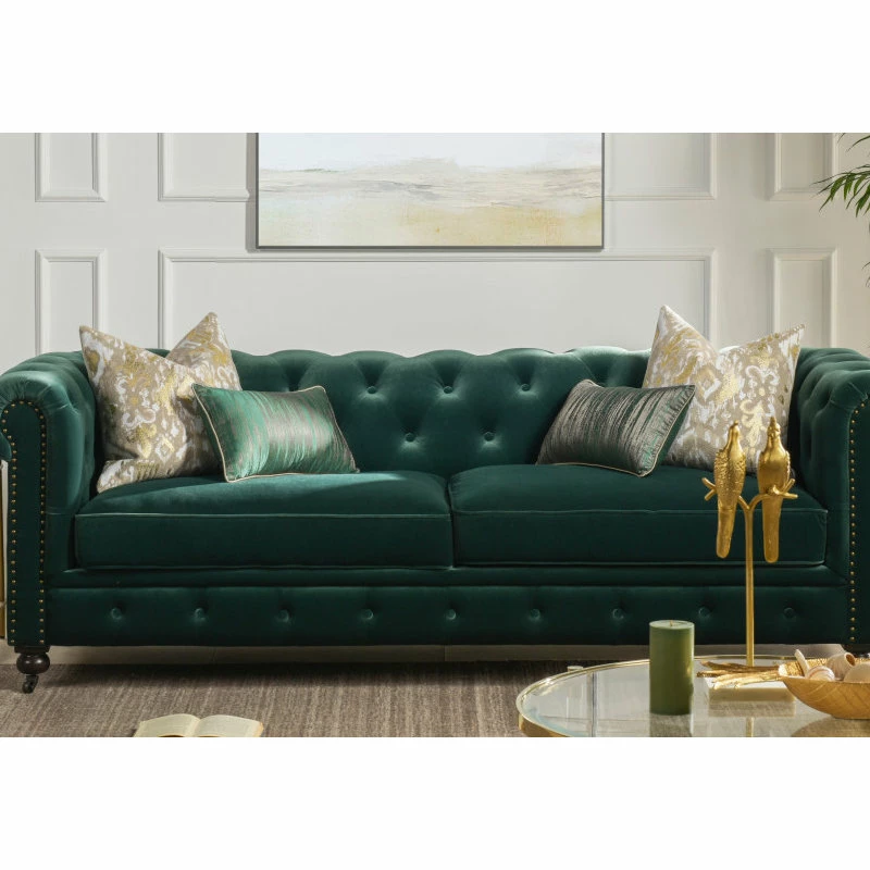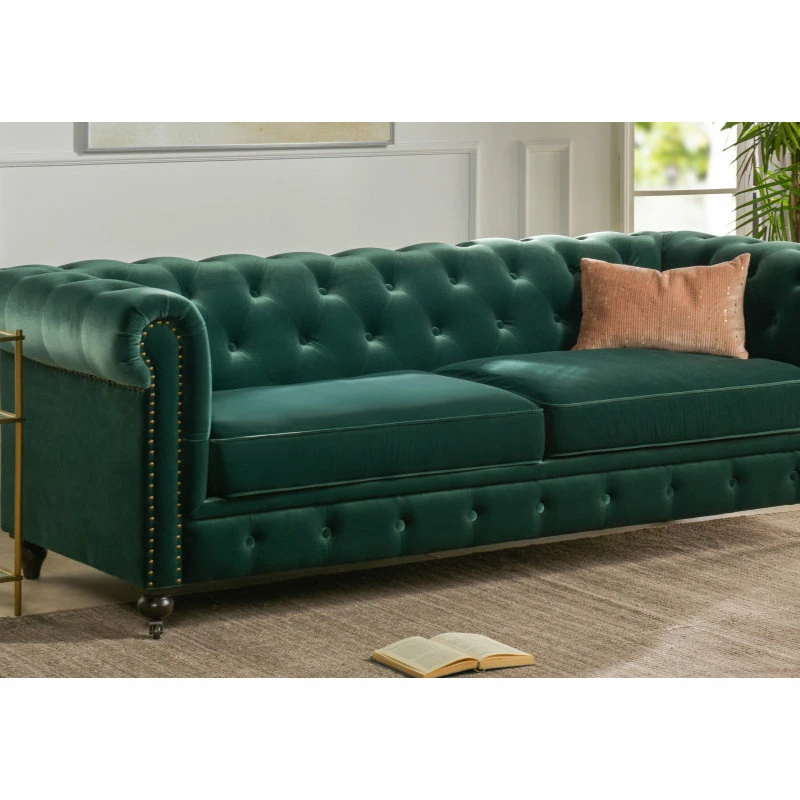 - Classic Chesterfield silhouette with rounded arms and back and tall, shelter arms