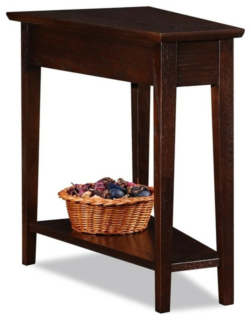 Finished in a rich hand applied chocolate oak finish, this table packs a highly useful punch into a small footprint. Scaled to fit most anywhere, this beautiful wedge is perfect between seating and offers a useful lower display shelf. The solid wood top offers construction that’s meant to be used.