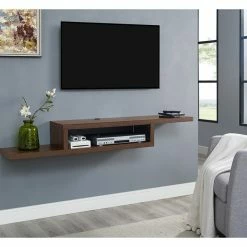 The 60″ Wall Mount TV Console has a modern flair with the appearance of a floating shelf and a unique asymmetrical design. Finished in a Columbian Walnut laminated wood tone with black accents, this bold design is functional and visually striking. The shelf is designed to hold 1 audio/video component along with a sound bar in the top shelf. It holds up to 70 Lbs. and comes with mounting hardware for standard wood stud wall installation. The wall mounted console boasts concealed wire management and assembles in minutes. Backed with a 5 year warranty.