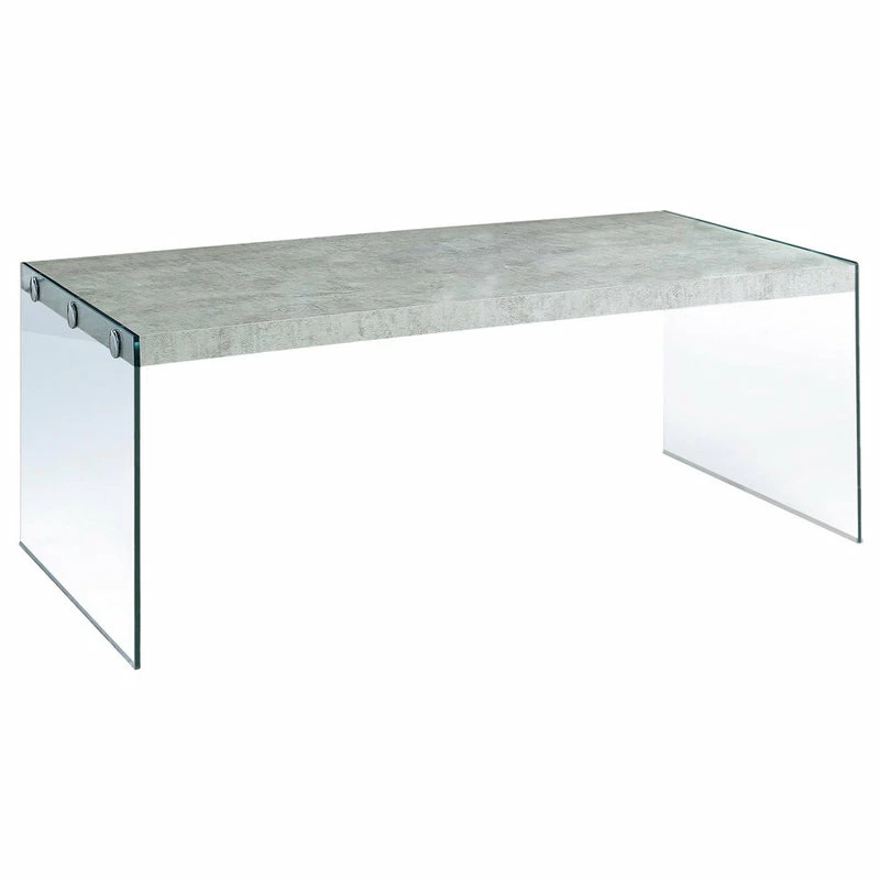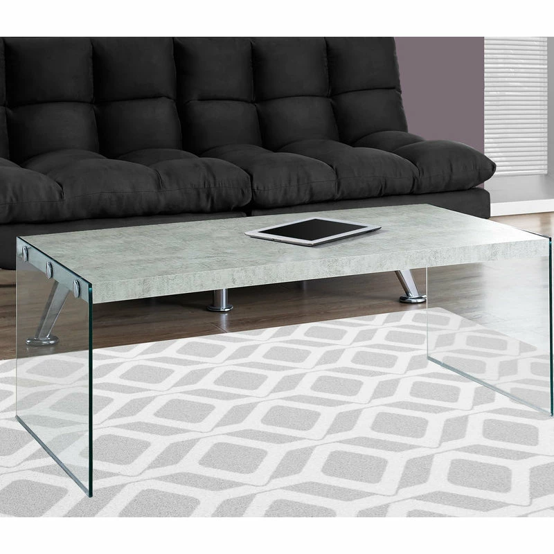 With a trendy grey cement-look table top and thick tempered glass sides, this rectangular cocktail table gives an exceptional look to any room. The unique tempered glass base provides sturdy support along with a contemporary styling. This multi-functional coffee table will easily compliment a modern space in a living room, office, den, or family room.