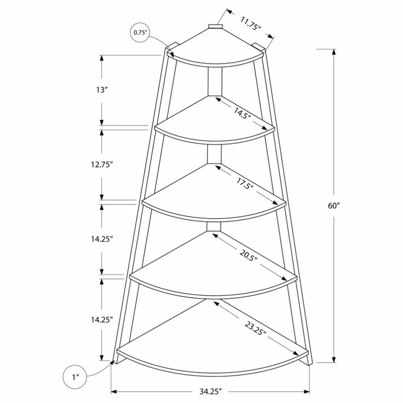 Add the perfect corner piece to your living room, hallway, home office, or den with this cappuccino accent etagere/bookcase complete with four 1″ thick tray style shelves. This contemporary/transitional shelving unit blends well with any decor providing additional display space without sacrificing style. Tipping pervention hardware included.