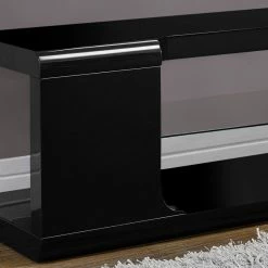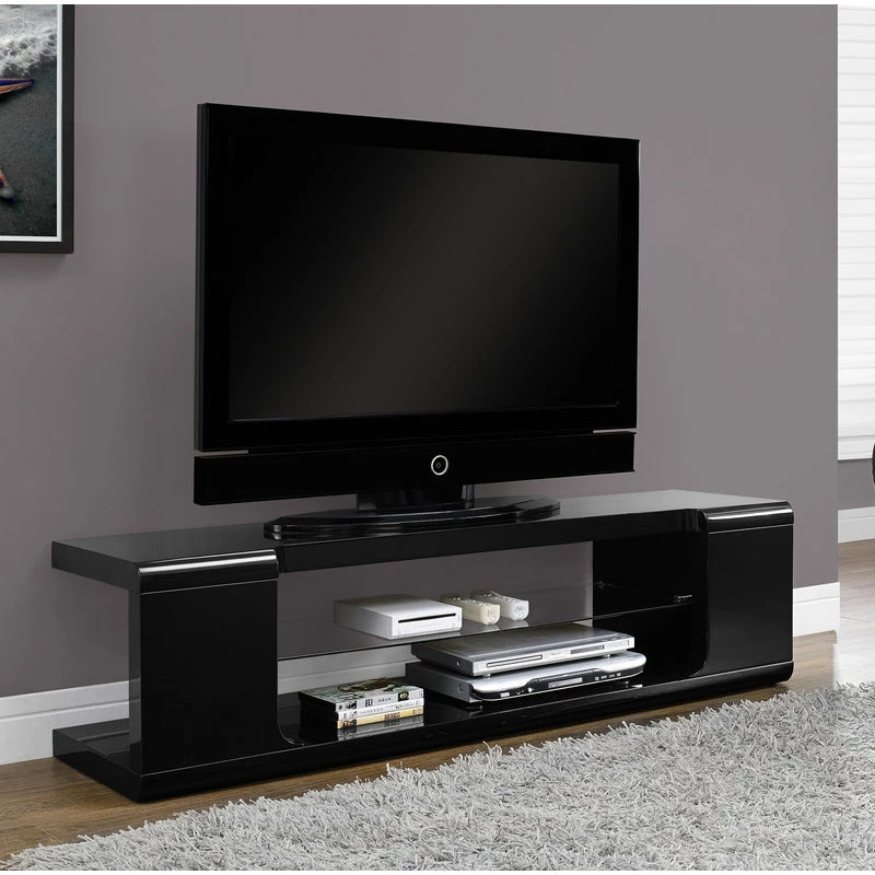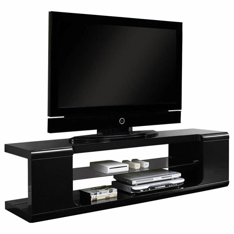 The Modern TV Stand is a sleek and practical option for the living room, featuring an elegantly curved, glossy white base. The black stand provides ample storage for media devices with its two shelves, one of which is made of glass. Accommodate TVs of up to 60 inches with this bold modern entertainment stand.