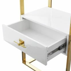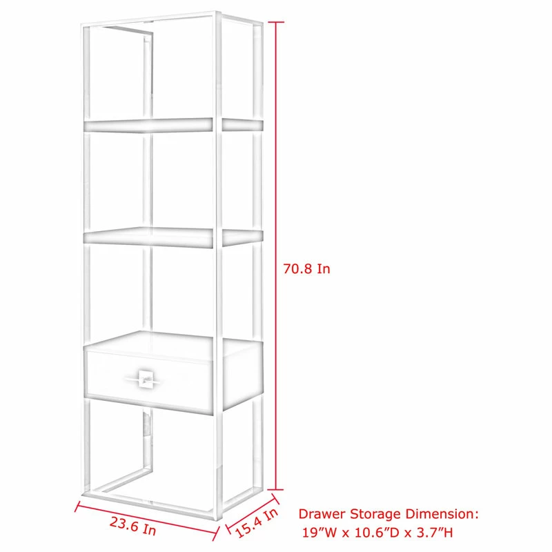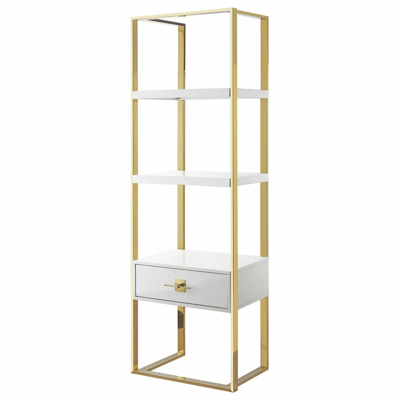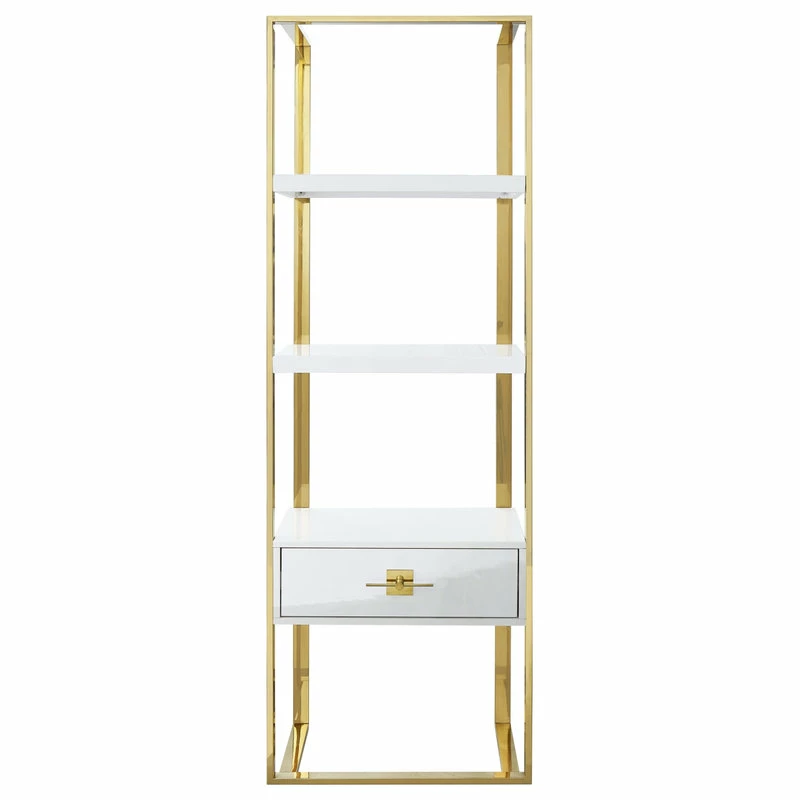 Sleek and stylish combination of materials gives this etagere bookcase/bookshelf a fresh contemporary look. The shelves and a drawer have a high gloss lacquer finish while stainless steel frame and pull handle have a polished look. If you love the shiny modern style, this clean and glamorous bookcase desk will immediately capture your attention, providing the look you want. Featuring 1drawer for storage, 3 shelves and beautiful shiny hardware, this exquisite piece is an excellent solution for modern home.FEATURES: