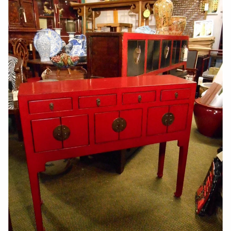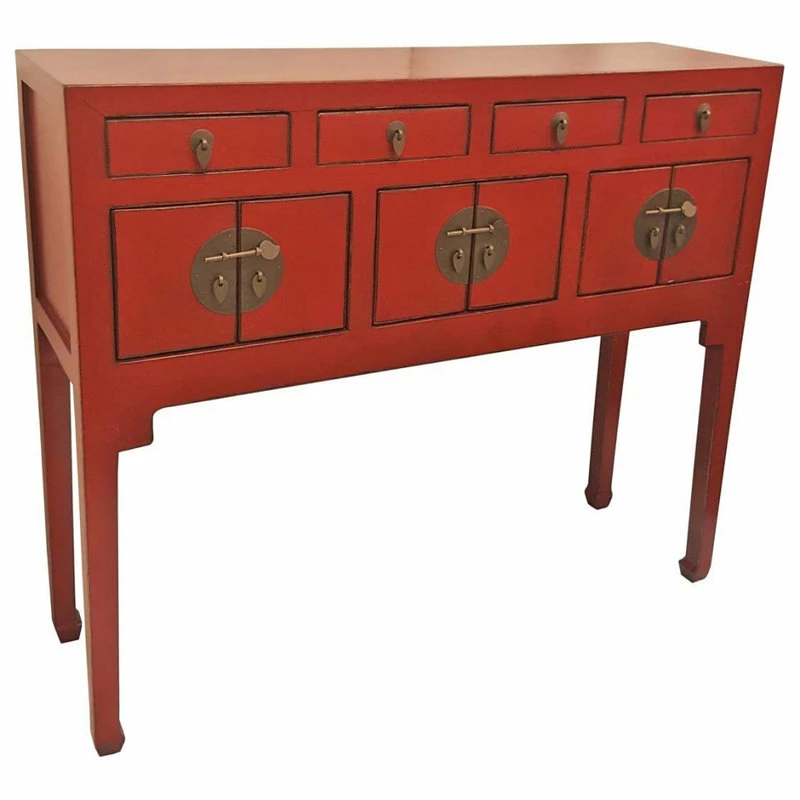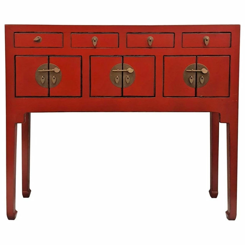 This elegant Chinese table is from northern China and is made of reclaimed lumber. Chinese reproduction antique sofa table with drawers and doors is hand rubbed red lacquer with new brass. Has a unique design with it simple elegant horse hoof foot and clean lines. Rich fine lacquer with highlights of contrasting color. Lacquers are beautifully hand applied in many coats. This cabinet can be used for storage, a small writing desk or a makeup table. Clean and simple lines it measures 37.5″ x 11″ x 32″ inches high. Works in a modern, rustic or cottage interior. Finished inside and out.
