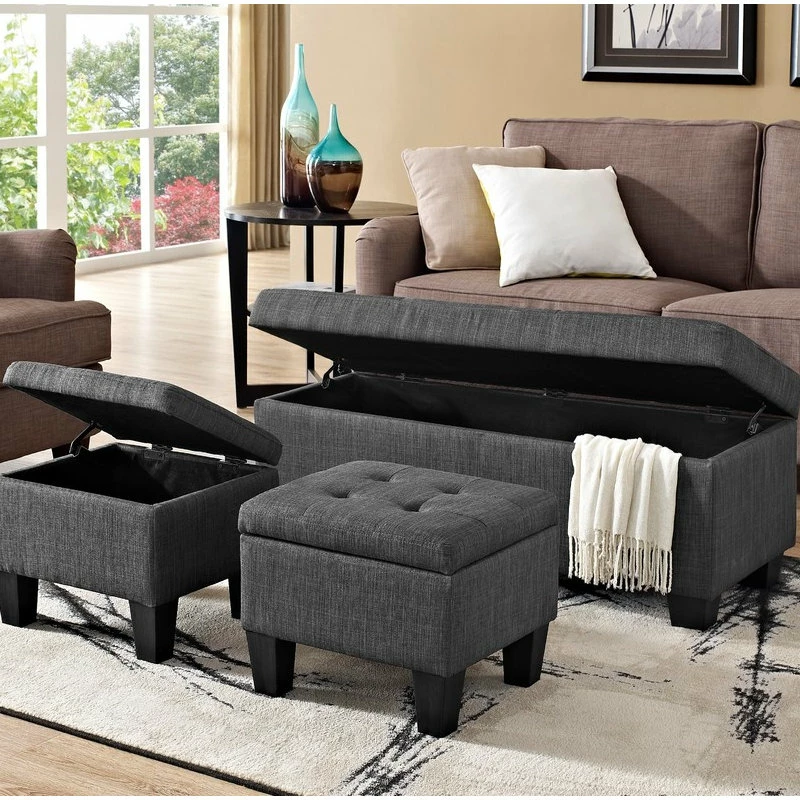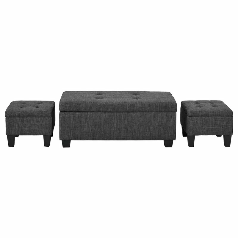 The stylish Everett 3-Piece Storage Ottoman Set provides handy storage while enhancing your modern design. Featuring a tufted bench with a full-size storage compartment and 2 smaller ottomans, your living room will have plenty of storage space and extra seating. The Everett 3-Piece Storage Ottoman Set pushes the boundaries of contemporary style with aesthetically pleasing function.