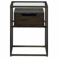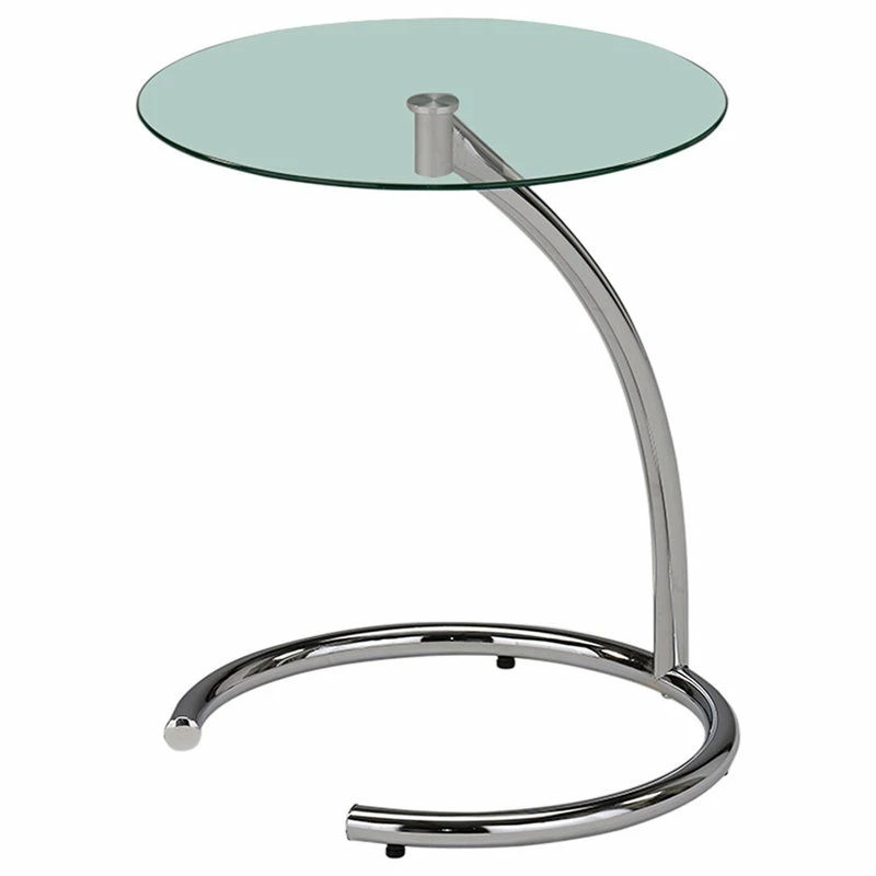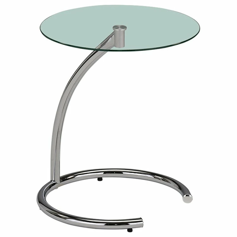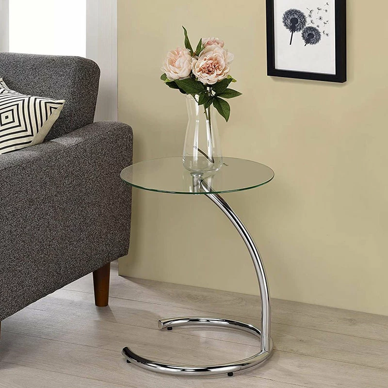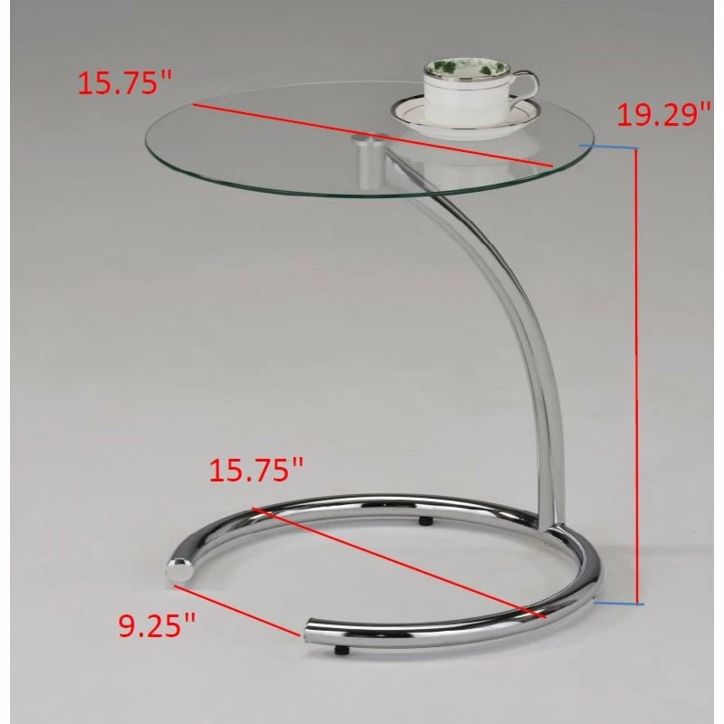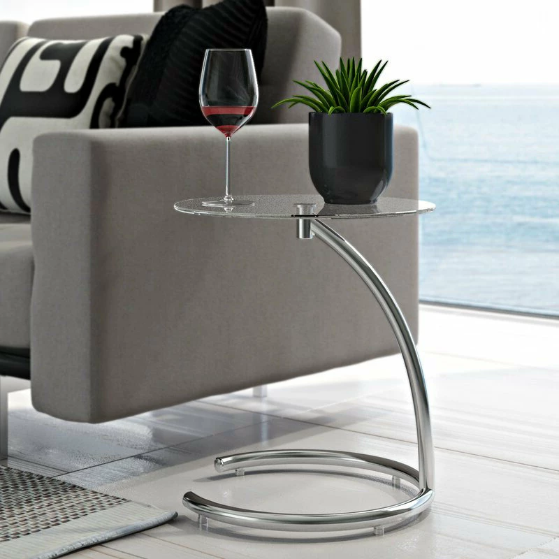 Kapoor Modern Accent Side End Table, Chrome Metal Base & Clear Glass Top, 16-Inch Round. Whether sidled up beside your sofa or acting as a nightstand in the master suite, this Kapoor End Table is always a stylish stage. Boasting a contemporary appearance, it pairs a curved metal base finished in polished chrome with a clear glass top. Measuring 19 inches tall by 16 inches in diameter, it offers plenty of space to display a gleaming lamp on top and keep a basket in the empty area underneath.