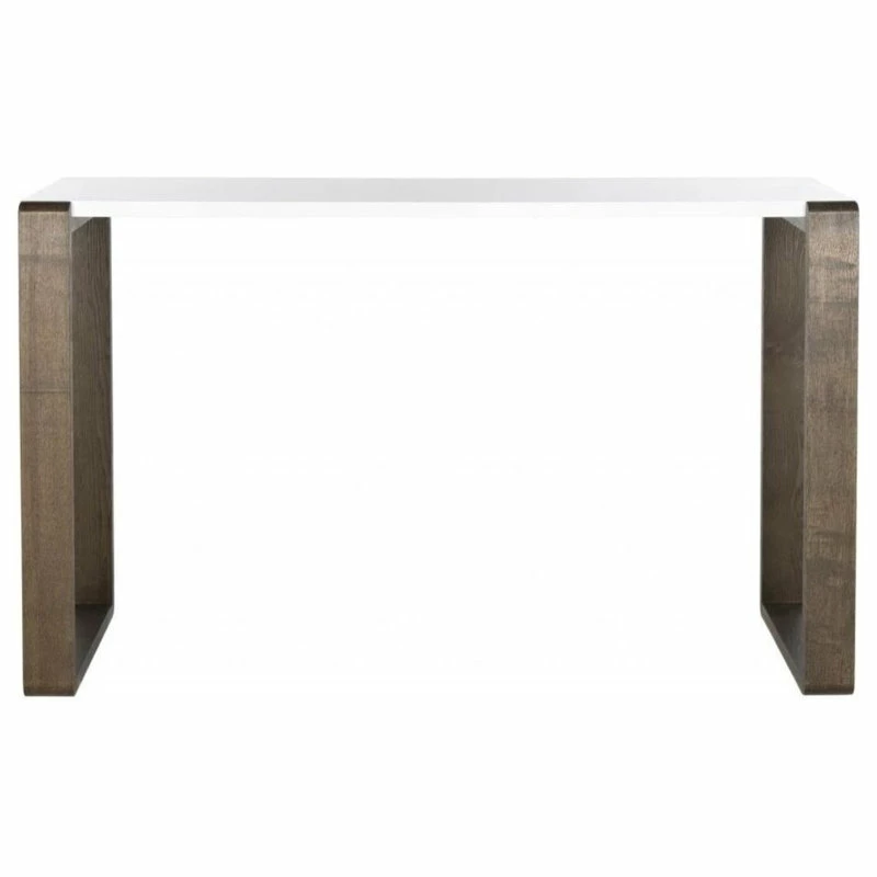 Rugged meets refined in the contemporary Bartholomew console table with white lacquer top and chunky wood grained base in a chic dark brown finish. Whether set in a penthouse or loft, this dramatic console will command attention in a living room or hall.
