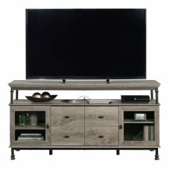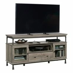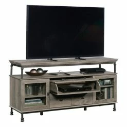 Industrial-inspired style? Yes please! Create a one-of-a-kind look in any room of your home with the charming appeal and modern design of this credenza from the Canal Street® collection. It accommodates up to a 60” TV, making it the ideal spot to cozy up around to binge watch your favorite show or have all-day movie marathons with your friends. Switch it up and use its spacious top surface as a place to display your favorite décor items like a lamp, decorative plants and photos of your family. It features a large open shelf that includes built-in USB ports for easy charging of your electronic devices and gadgets. Behind each of the framed, safety tempered glass doors is a storage and display area with an adjustable shelf that can move to different heights to create flexible options for items of all shapes and sizes. Its Vanishing Drawer™ provides you with a hidden storage area behind its flip-up front for your video/audio components. Finished in Northern Oak® and detailed with a decorative, powder coated metal frame, this versatile credenza gives your home the style you’ve been dreaming of.