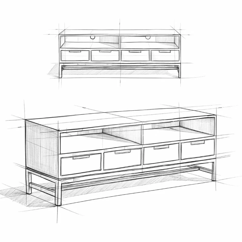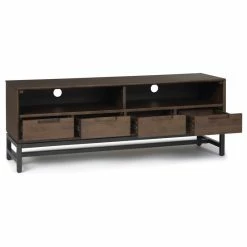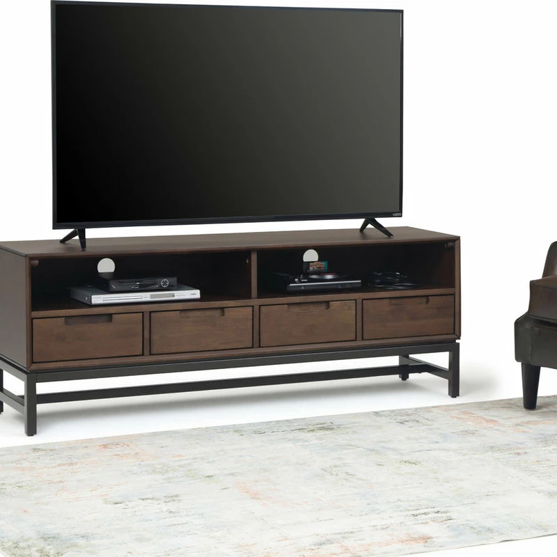 The Banting Collection is made from richly-grained solid Rubberwood. This mid-century modern industrial collection has a clean angular metal base, with square, simple modern drawer and table top. With no visible hardware, and only simple wood pull handles, the solid Rubberwood top, is simple and uncomplex. The Banting 60 inch Low TV Table has four working drawers with full extension ball bearing drawer glides, and an open storage area for your media devices to maximize functionality. The 60″ width is perfect for TVs up to 65 inches and gives you lots of storage possiblities. The Banting collection includes coffee, console, end tables, tv stands, sideboard buffet, desks and bookcase.