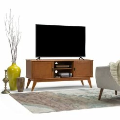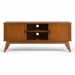 Your TV deserves a stylish and sturdy stand. The Draper Mid Century modern Low TV Media Stand is a well-designed piece of furniture. The center features two shelves with cable management cutouts for your electronics. Two side cabinets each have one adjustable shelf for your DVD or game collection. This 26″ high stand can accommodate a TV up to 65″.