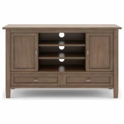 Having just purchased your dream large flat screen TV – you need the perfect TV Stand to enhance your viewing pleasure. Look no further. The Warm Shaker TV Stand is perfectly sized for TVs upto 55 inches. The 29 inch height puts the TV at a level that is ideal for comfortable viewing. The Warm Shaker TV Stand has plenty of storage and space for all your media and gaming devices. It has a large centrally located open area with two adjustable shelves and two bottom drawers. The two side storage cabinets open to one adjustable shelf. The unit features cord management cut-outs for easy installation of TV and media components.