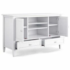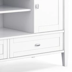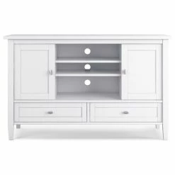 Having just purchased your dream large flat screen TV – you need the perfect TV Stand to enhance your viewing pleasure. Look no further. The Warm Shaker TV Stand is perfectly sized for TVs upto 50 inches. The 29 inch height puts the TV at a level that is ideal for comfortable viewing. The Warm Shaker TV Stand has plenty of storage and space for all your media and gaming devices. It has a large centrally located open area with two adjustable shelves and two bottom drawers. The two side storage cabinets open to one adjustable shelf. The unit features cord management cut-outs for easy installation of TV and media components.