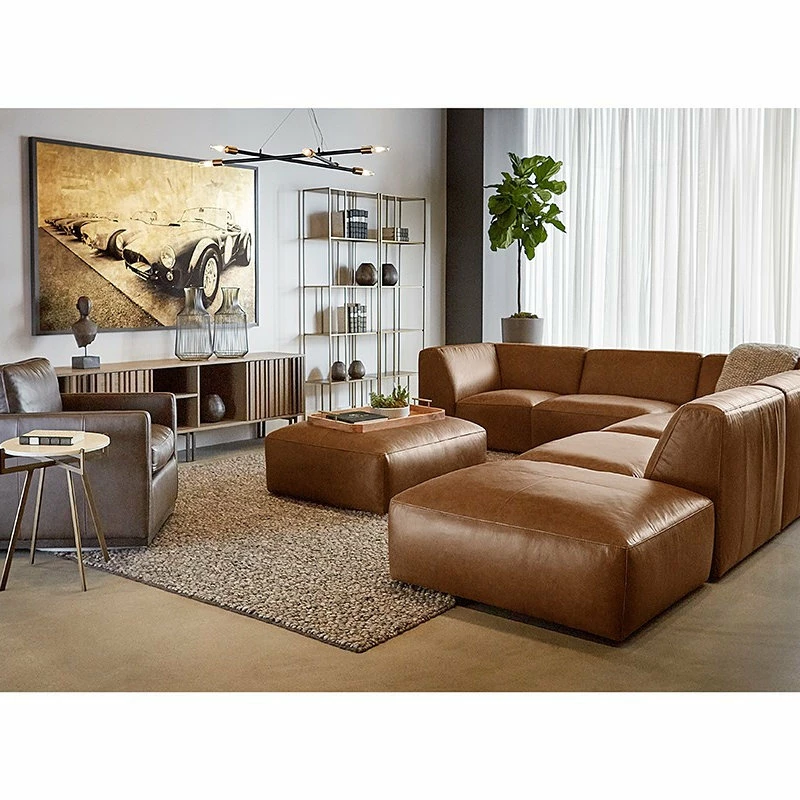 A robust swivel lounge chair from our 5West collection. The modern design features a streamlined silhouette with track arms. Stocked in marseille concrete and camel leather. Handle with Care: This design has been crafted with 100% buffalo leather. Leather is a natural material; as such, colour variations, markings, wrinkles, grooves and light scratches are acceptable and appreciated characteristics. No two pieces are alike. Visit our Product Care page for more information on how to ensure the lasting beauty of this piece.
