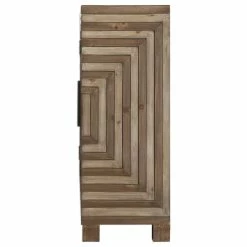 - Geometric parquetry style console, with rustic two toned fir veneer and old iron bar pulls. Center portion opens to two fixed interior shelves.