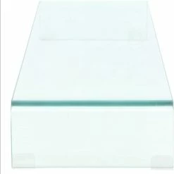 This practical TV stand has a tempered glass construction. The sleek, streamlined design of this understated TV unit will add a modern touch to your living space. This glass shelf can be used as a TV stand or riser for your desktop monitor, television, laptop and other multimedia devices. With the glass shelf raising the monitor, you will have a better view of the screen while sitting comfortably, which helps to reduce the strain and discomfort on your neck or back. The space underneath can accommodate your DVD player, game console, streaming device, receivers, and media carriers. The glass frame is tempered for added strength and safety. The smooth surface is easy to clean with only a damp cloth.