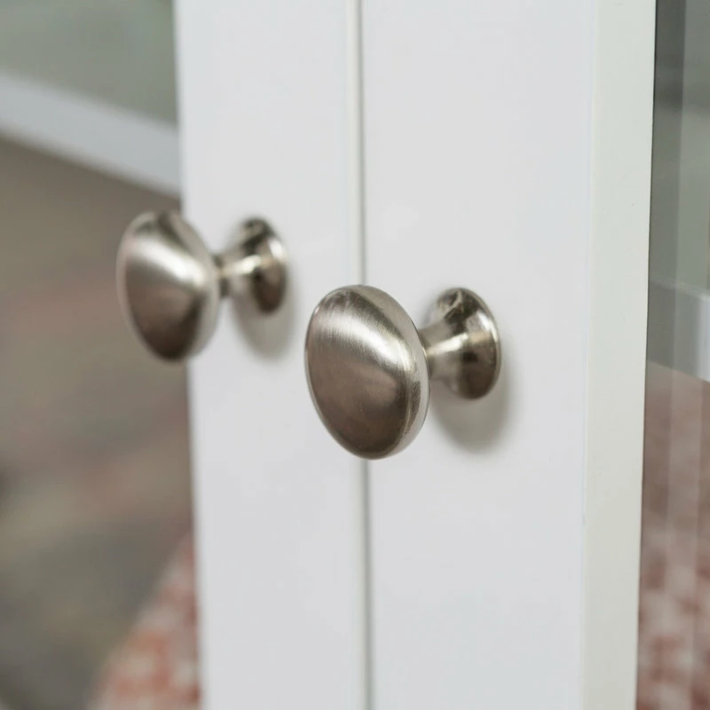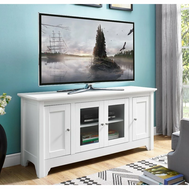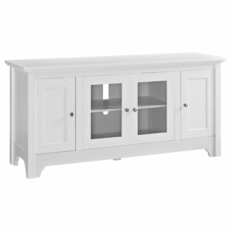 The TV Stand is built with style and convenience in mind. Featuring a sturdy MDF frame, three spacious cabinets with adjustable shelving provide ample room for gaming consoles, cable boxes, media and more, with a cutout in back for cable management. Two tempered glass doors help to break up the plain white finish and allow you to use the remote without having to open the cabinet doors.