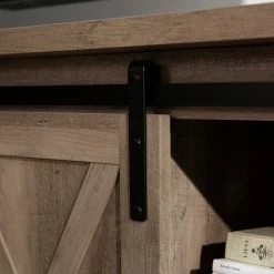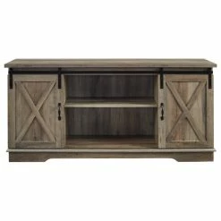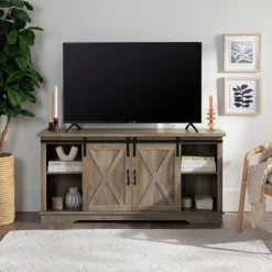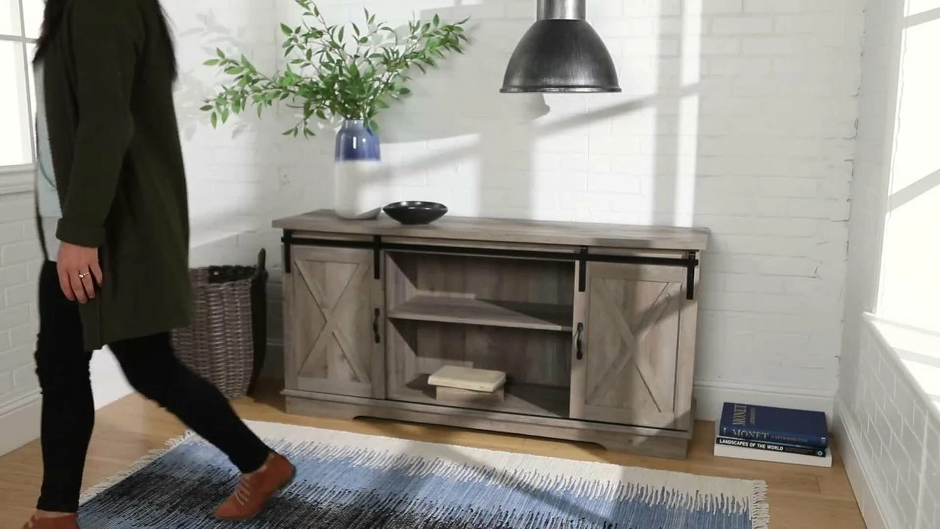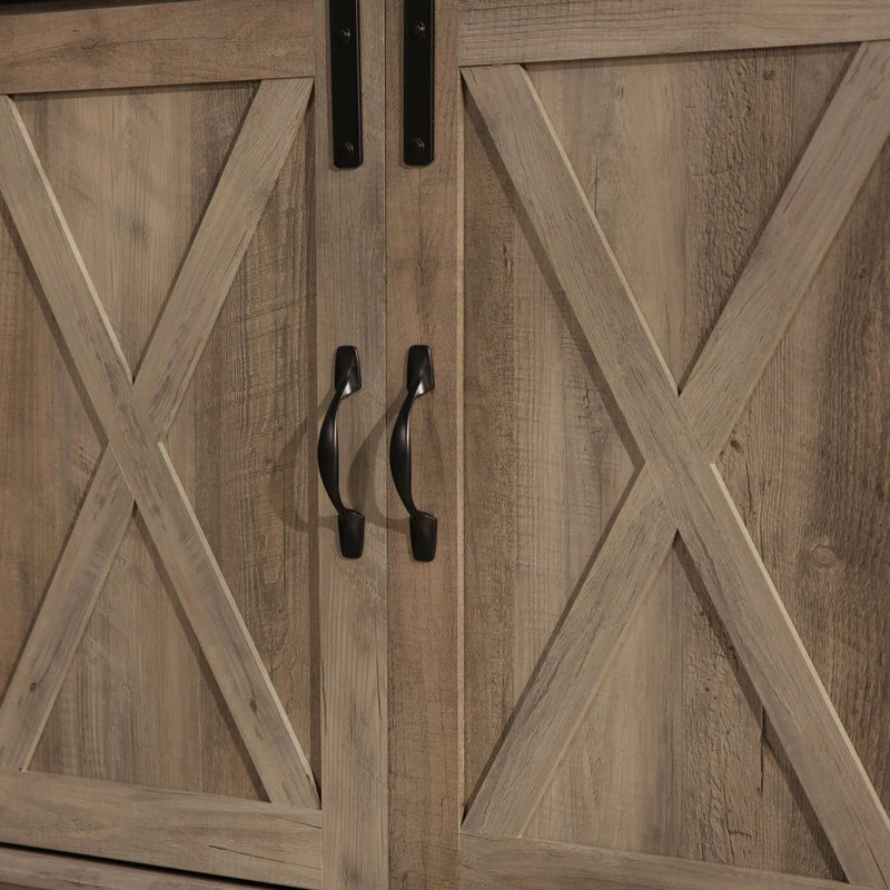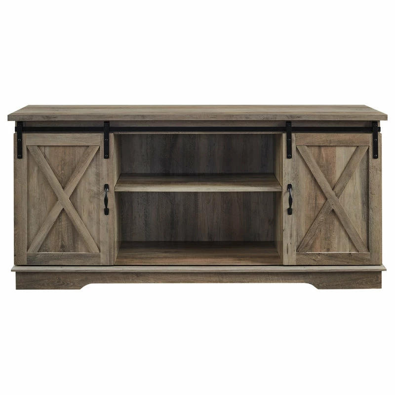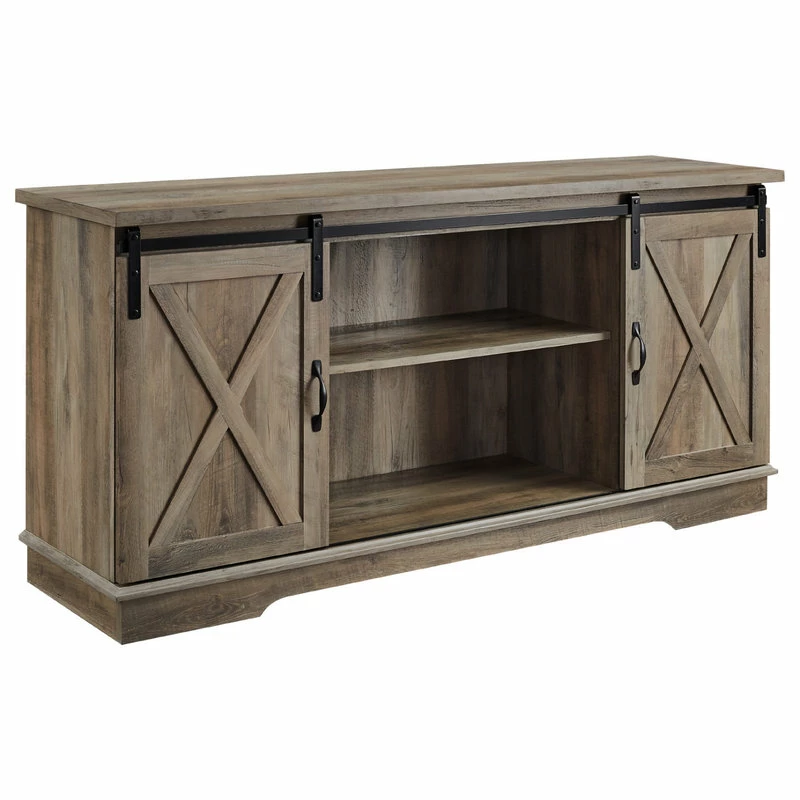 This TV stand will give your living room a charming country feel, while also providing plenty of storage space for your electronics and decor. Featuring two sliding barn door styled cabinet fronts for a versatile design where you can either close off the middle or both sides, depending on your needs. Adjustable shelving and cable management make it simple for you to keep your electronics in one place. This media console is constructed of high-grade MDF. The modern farmhouse style of this entertainment center will become a piece in your living room you’ll admire.