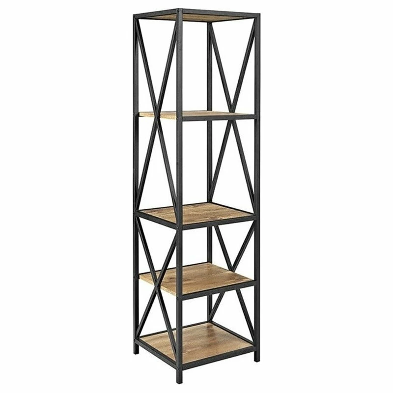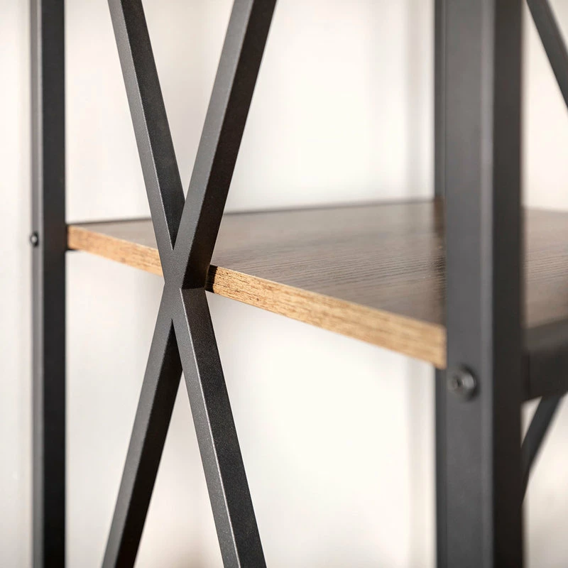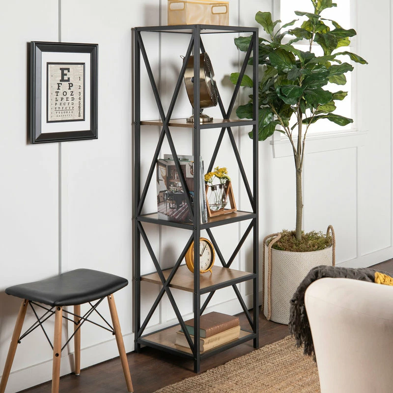 Showcase your books, magazines, media, and more with this tall x-frame metal and wood media bookshelf. Durably constructed of warp-resistant MDF with a powder coated metal frame, together create a sturdy, yet stylish shelving unit. The simple x-frame design is the perfect accent for your living room, kitchen, bedroom, or entryway.