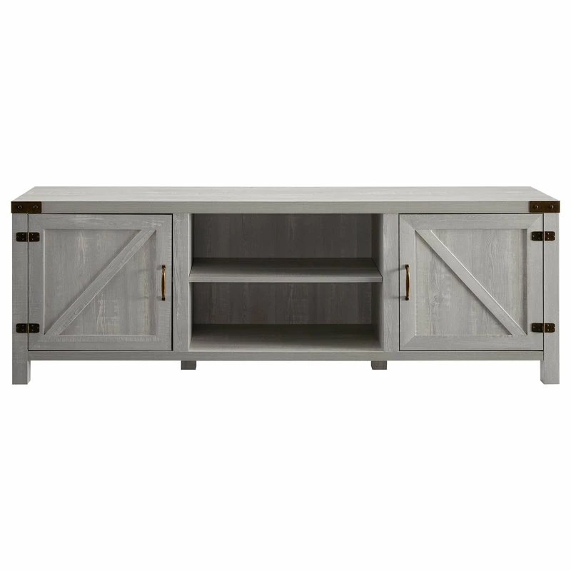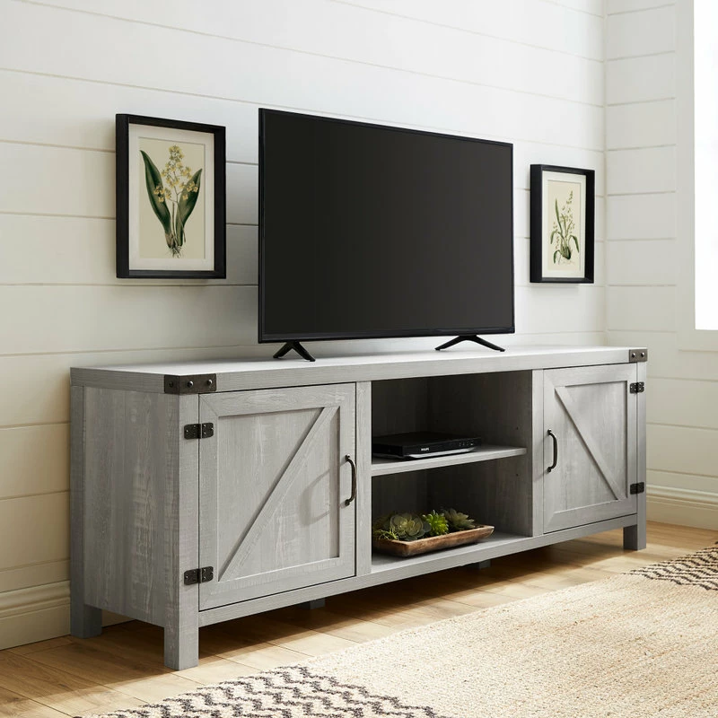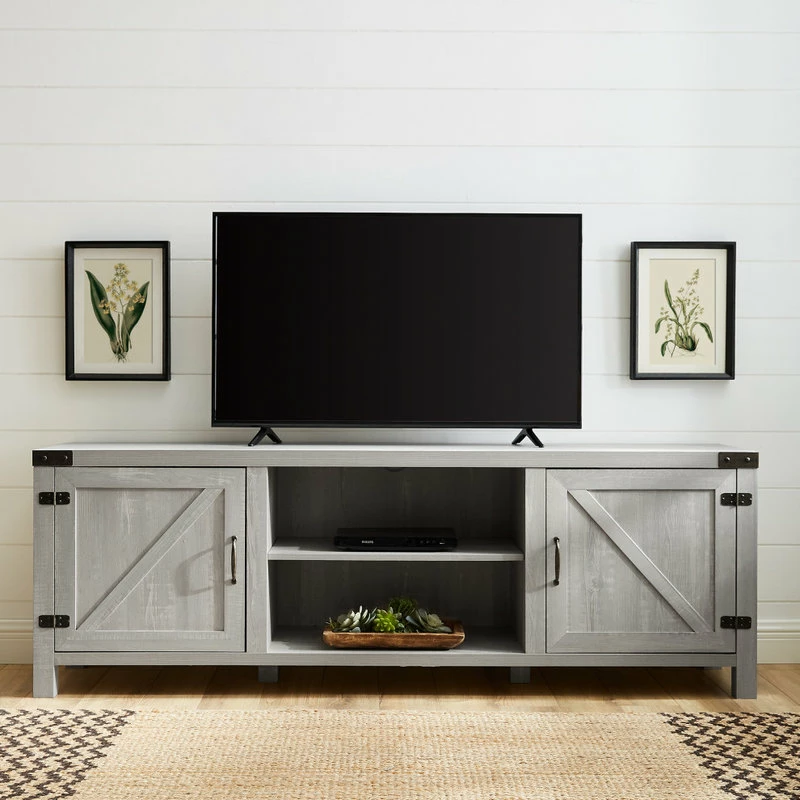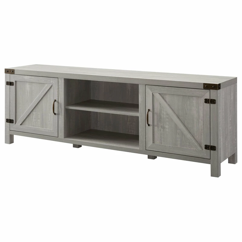 Bring the idyllic charm of farmhouse life into your home with this 70β barn door console. Cord management options, adjustable shelves, and the ability to accommodate up to 78β TVs make this entertainment stand a strong functional choice. Itβs also a reliable style choice when you want to add a rustic flair to your home. Exposed hinges, decorative corner brackets, and the popular barn door style doors corral this media console into the winners’ circle.