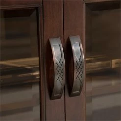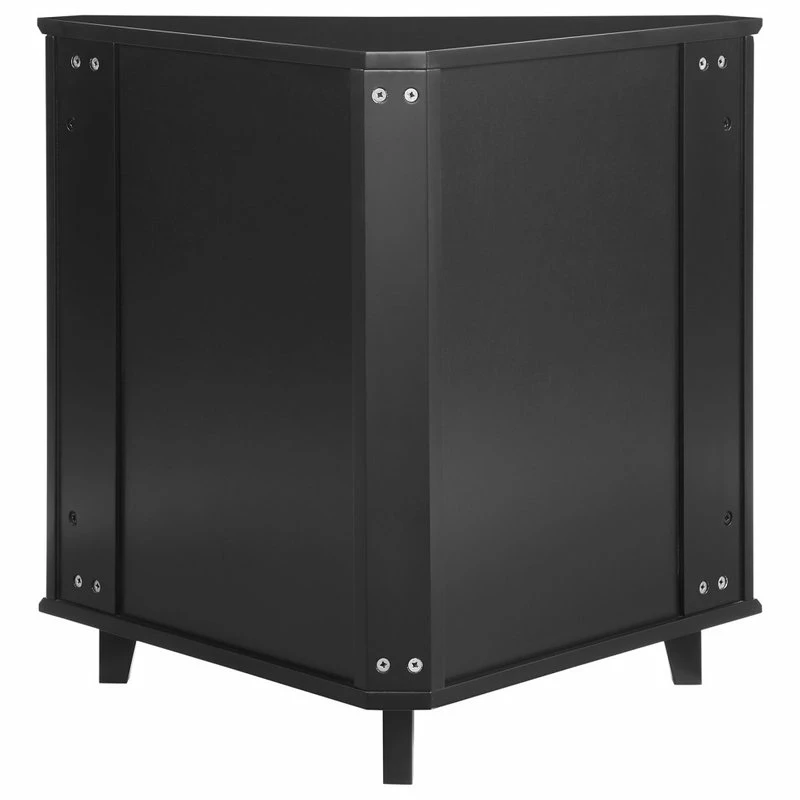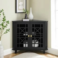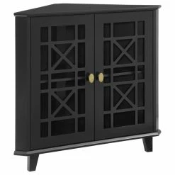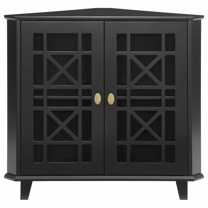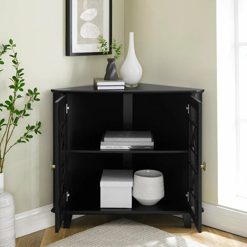 Donโt fret about what youโll display in that empty corner of your living room, bedroom, or home office. The unique fretwork of this gorgeous piece will be the crowning glory where the walls meet in your home, and can easily spice up your space as a corner accent table or stylish bar cabinet. This transitional piece boasts delicate painted steel handles that complement the tableโs understated minimalism, while the intricate cutouts on the front lend a subtle nod to contemporary global design. Furnish the corner accent table with a decorative array of tasteful dรฉcor, or use it to store your familyโs favorite board games, storybooks, or DVD collection that you can hide behind the two soft-close doors.
