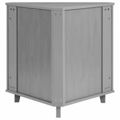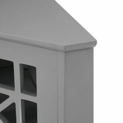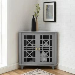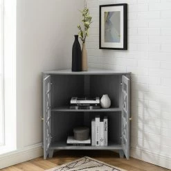 Donโt fret about what youโll display in that empty corner of your living room, bedroom, or home office. The unique fretwork of this gorgeous piece will be the crowning glory where the walls meet in your home, and can easily spice up your space as a corner accent table or stylish bar cabinet. This transitional piece boasts delicate painted steel handles that complement the tableโs understated minimalism, while the intricate cutouts on the front lend a subtle nod to contemporary global design. Furnish the corner accent table with a decorative array of tasteful dรฉcor, or use it to store your familyโs favorite board games, storybooks, or DVD collection that you can hide behind the two soft-close doors.