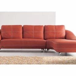 A fabulous balance of contemporary and retro styling, our Lucy sectional delivers social poise and grace in refined abundance. Soft high density foam seating combines with premium contrast off-white double top-stitching and genuine top grain Italian leather, creating an indulgent retreat. The rich, burnt orange color will warm any living room up with legendary results. Top if off with sculptural chrome legs and you have a spectacular piece that is sure to turn everyone’s heads! Includes one matching throw pillow.